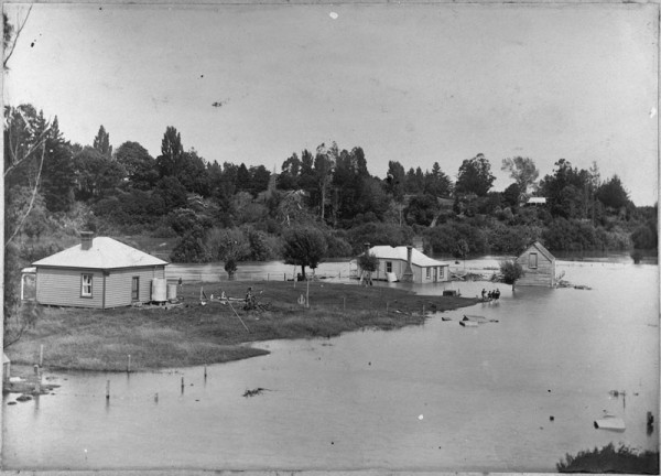 This is another photo showing the flooded river. You can see Isaac Coates home ‘Wairere’ in the background on the right in this photo.